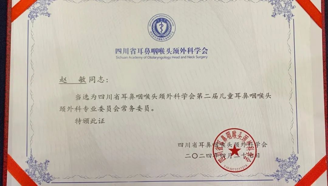 2024年,赵敏当选“四川省耳鼻咽喉头颈外科学会第二届儿童耳鼻咽喉头颈外科专业委员会常务委员”;在首届耳鼻咽喉头颈外科中青年医师儿童耳鼻咽喉疾病诊疗病例大赛中,赵敏就《不可忽视的鼻塞》病例作汇报分享,荣获大赛“优秀奖”,收获业内广泛认可。